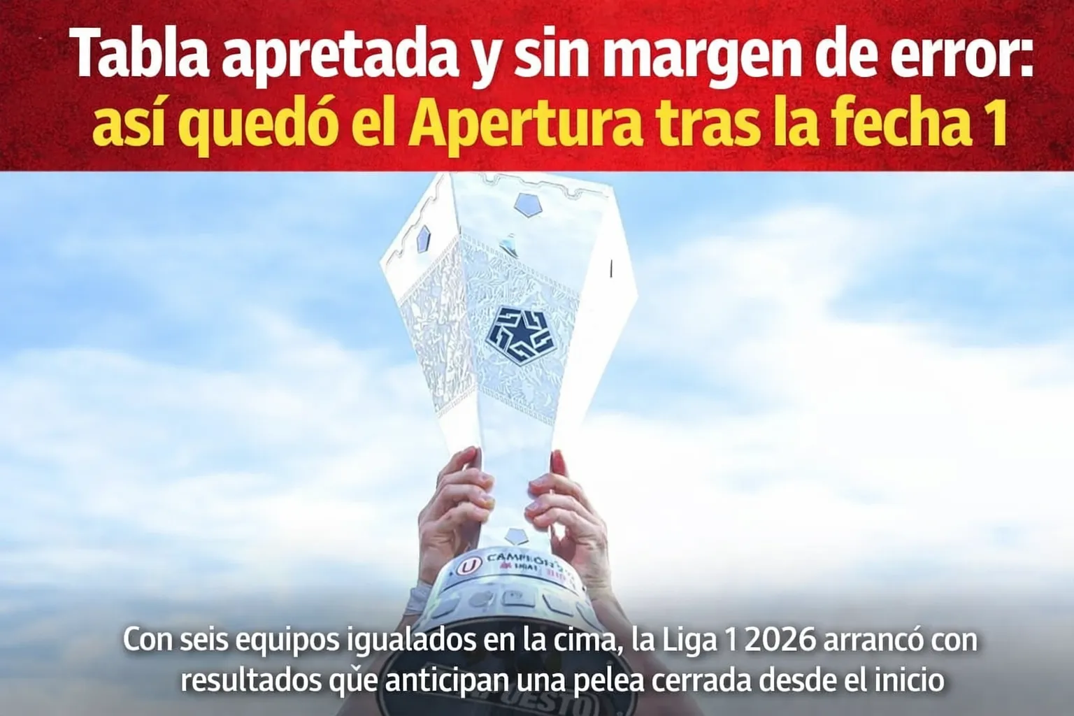 La Liga 1 2026 inició oficialmente el viernes 30 de enero con la disputa de la primera fecha del Torneo Apertura, que comprendió nueve encuentros a nivel nacional. Universitario de Deportes, vigente tricampeón del fútbol peruano, debutó con una victoria en casa, mientras Alianza Lima logró un triunfo como visitante en Huancayo y Sporting Cristal rescató un empate en la altura del Cusco, en una jornada que dejó a seis equipos igualados con tres puntos en la cima de la tabla.